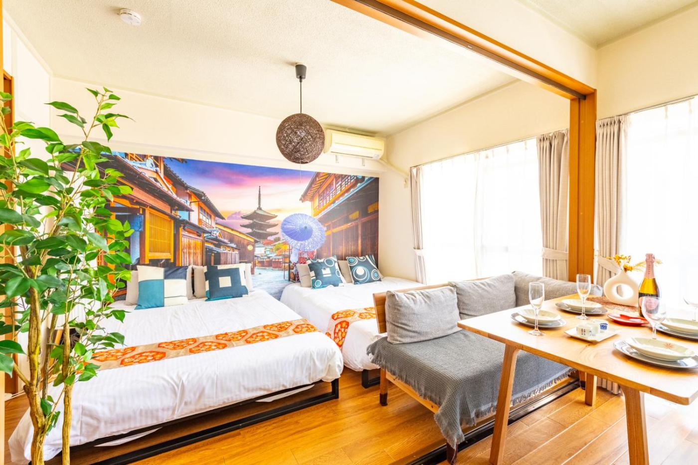 Two-Bedroom Apartment. The air-conditioned apartment has 2 bedrooms and 1 bathroom with a bath and a shower. In the well-equipped kitchen, guests will find a refrigerator, kitchenware, a microwave and a tea and coffee maker. Boasting a balcony, this apartment also offers a washing machine, tatami and a flat-screen TV. The unit has 4 beds.