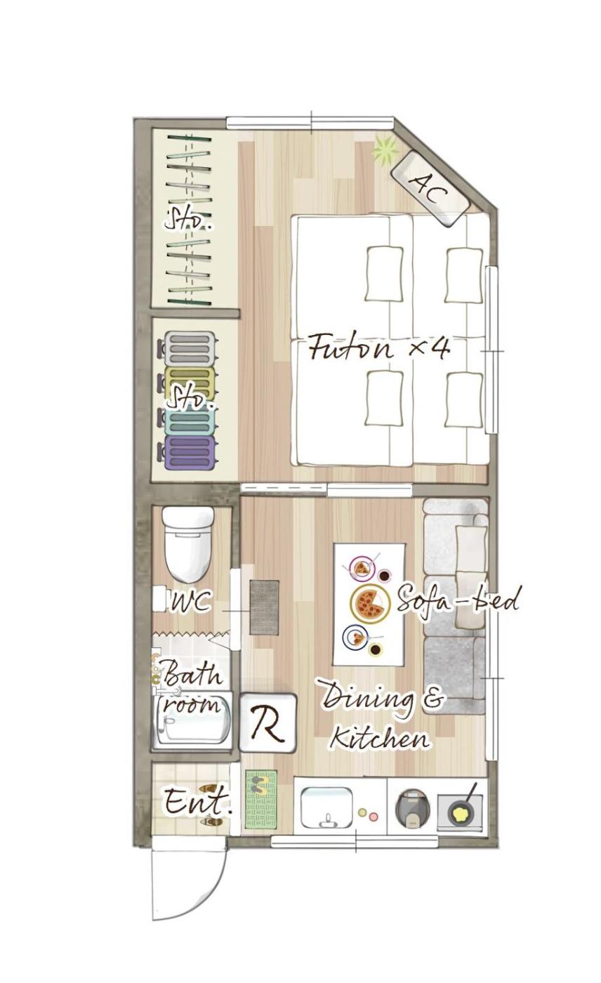 Three-Bedroom Apartment. Featuring a private entrance, this air-conditioned apartment comprises a kitchen, 1 bedroom and 1 bathroom with a shower and a hairdryer. Meals can be prepared in the kitchen, which comes with a stovetop, a refrigerator, kitchenware and a microwave. The apartment features parquet floors and provides a wardrobe, an electric kettle and a sofa. The unit offers 1 bed and 4 futons.