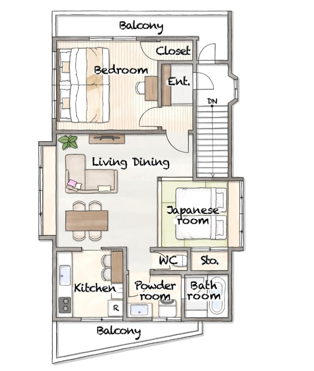 Two-Bedroom Apartment. Meals can be prepared in the well-fitted kitchen, which comes with a stovetop, a refrigerator, kitchenware and a microwave. The spacious air-conditioned apartment provides a flat-screen TV, a washing machine, tatami, a private entrance as well as a quiet street view. The unit offers 2 beds and 2 futons.