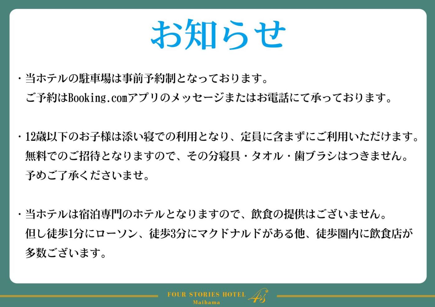 Situated within 1.3 km of Urayasu Local Museum and 1.5 km of Former House of Udagawa Family, Four Stories Hotel Maihama Tokyo Bay features rooms with air conditioning and a private bathroom in Urayasu. The property is located 1.5 km from Former House of Otsuka Family, 3 km from Tokyo Disneyland and 3.4 km from Tokyo Disney Resort. Free WiFi is available and private parking can be arranged at an extra charge.