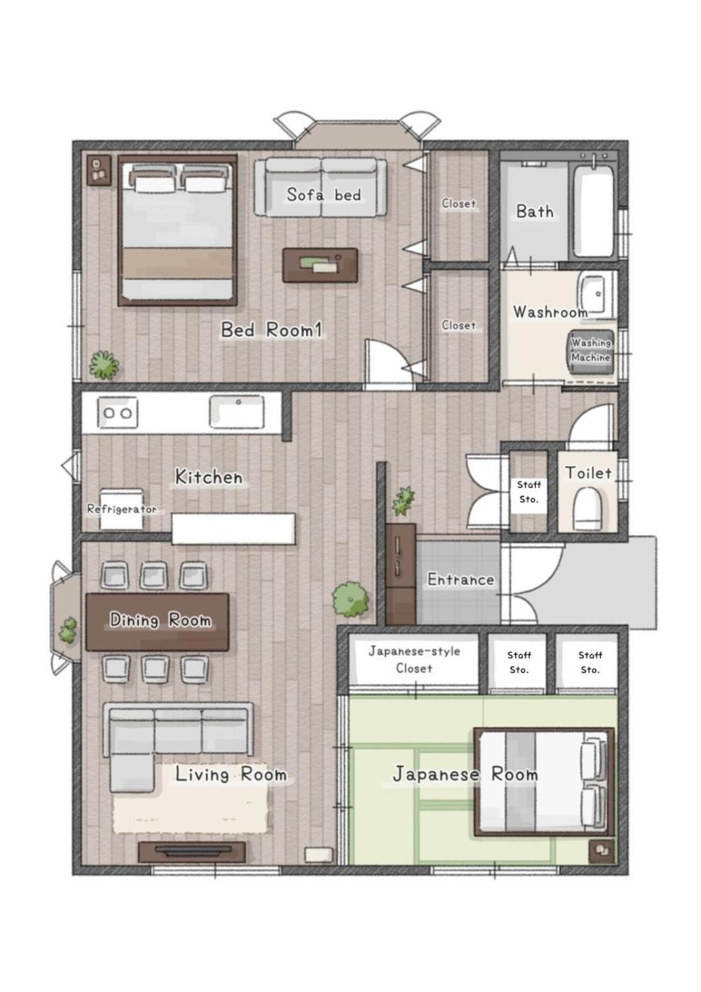 Two-Bedroom Apartment. Featuring a private entrance, this air-conditioned apartment consists of 1 living room, 2 separate bedrooms and 1 bathroom with a bath and a shower. Guests can make meals in the kitchen that is equipped with a stovetop, a refrigerator, kitchenware and a microwave. The spacious apartment provides a flat-screen TV with streaming services, a washing machine, tatami, a tea and coffee maker as well as garden views. The unit offers 4 beds.