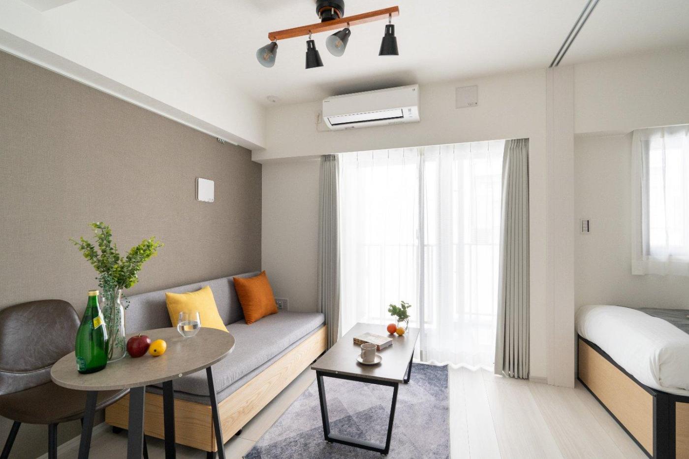 One-Bedroom Apartment. This air-conditioned apartment comes with 1 living room, 1 separate bedroom and 1 bathroom with a bath. Guests can make meals in the kitchen that features a stovetop, a refrigerator, kitchenware and a microwave. The apartment features a washing machine, a wardrobe, an electric kettle, as well as a balcony. The unit has 2 beds. ;
