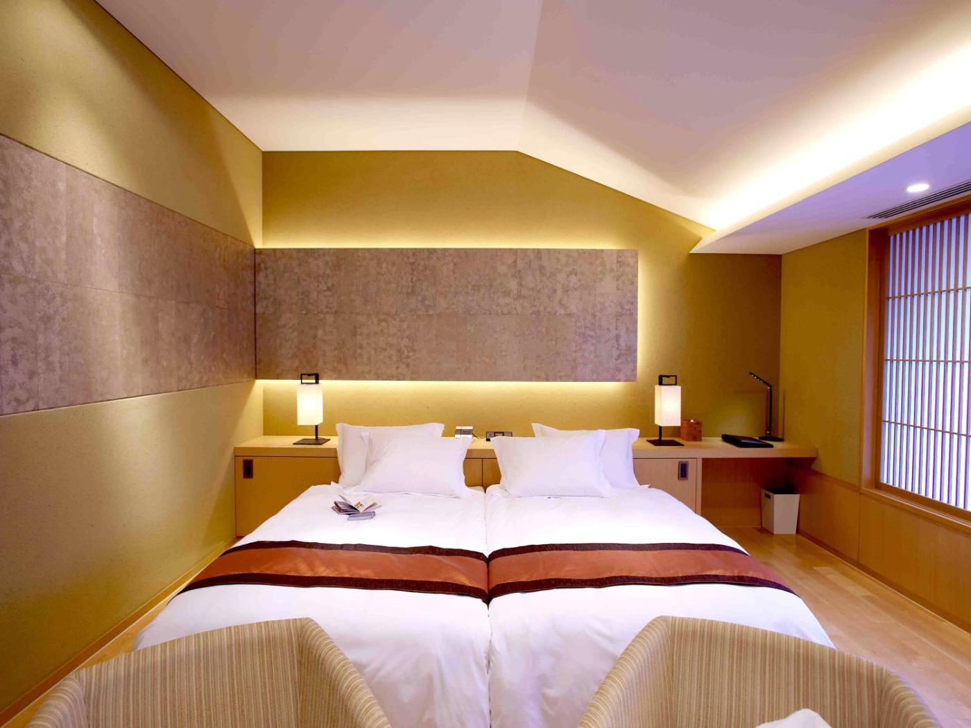Deluxe Twin Room. Bright room with tatami-mat flooring featuring Ryukyu tatami. Luxurious amenities are provided in the comfortable bathroom. ;